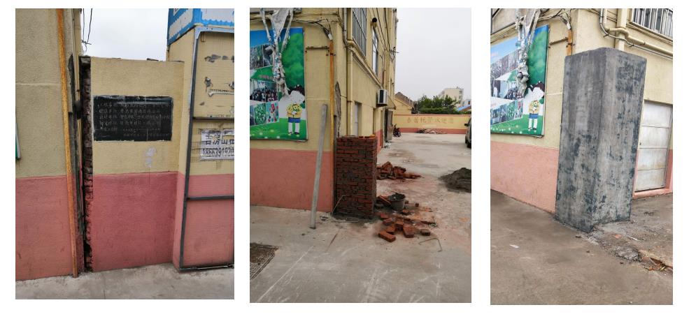 圖2: 危墻施工前、施工中、施工后